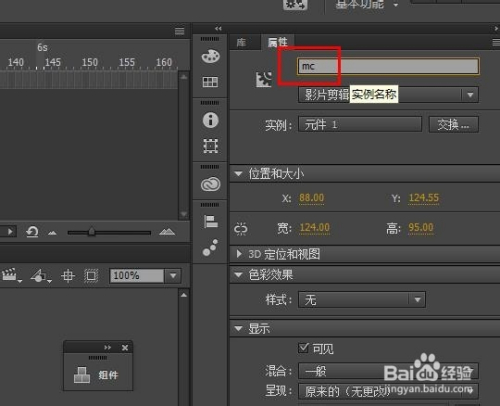 设置这个影片剪辑的实例名为mc,注重这个影片剪辑要在舞台上。