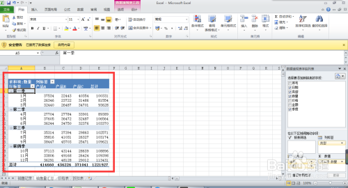 前提:建立数据透视表,按照月份和季度对”发卖记实“工作表中的三种产物的发卖数目进行汇总。