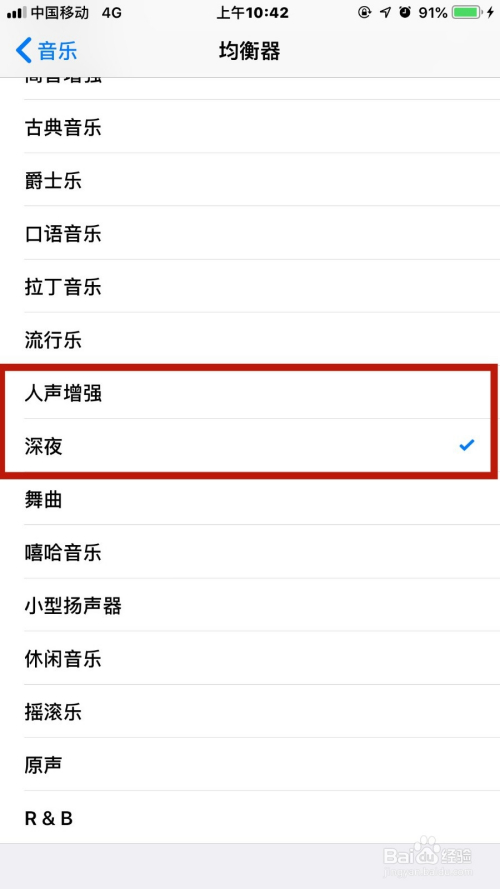 然后把平衡器的声调子整为【人声加强】或者【深夜】即可将手机外调子大