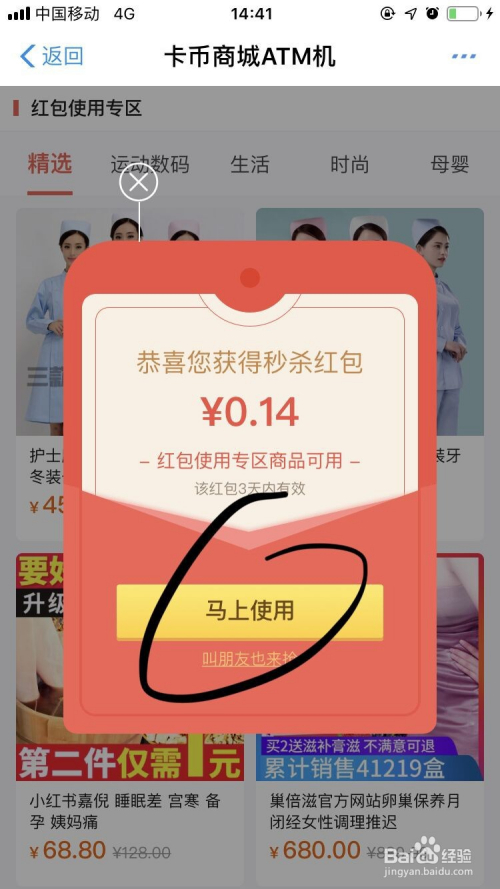 下面有个红包利用专区,在这个专区买的商品都可以利用红包。
