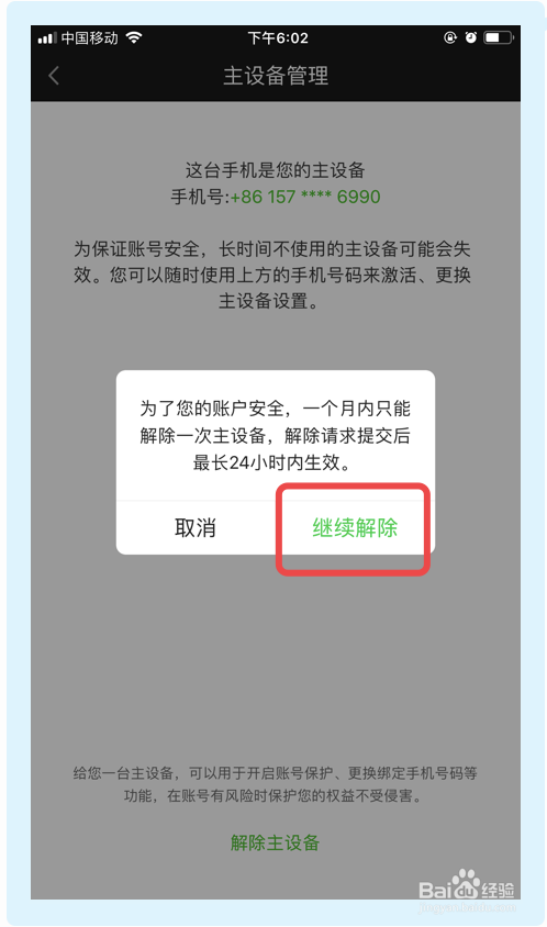 选择并点击弹出框的【继续解除】选项,即可解除此本家儿设备。