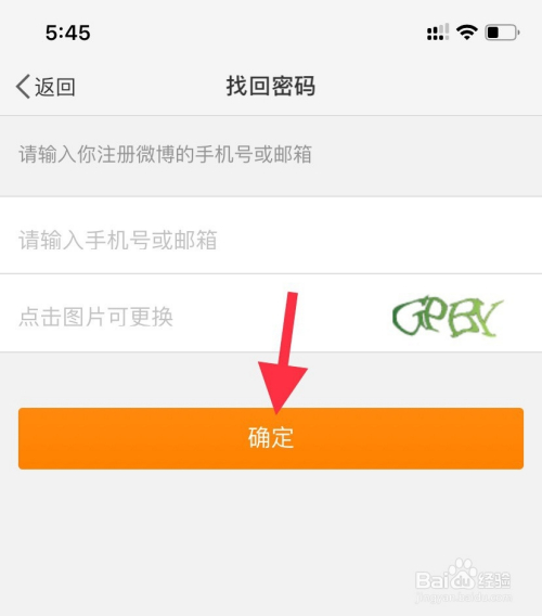 然后在找回密码页面中,输入你找回微博账号绑定的密码,再输入图片上验证码,然后点击“确定”。