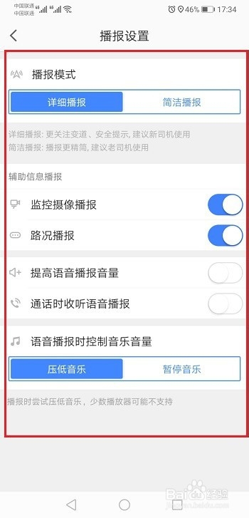 第五步进行设置语音播报,可以选择具体播报仍是简练播报,具体播报适合新手司机,然后开启监控摄像播报,路况播报,等,如下图所示: