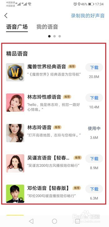 第四步进去语音广场之后,可以下载利用喜好的语音包,如下图所示: