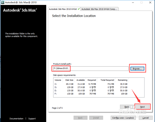 设置软件安装路径:在F盘(或其它盘)新建文件夹“3dmax2010”,点击“Browse(浏览)”,找到新建的“3dmax2010”文件夹,点击“Next”。