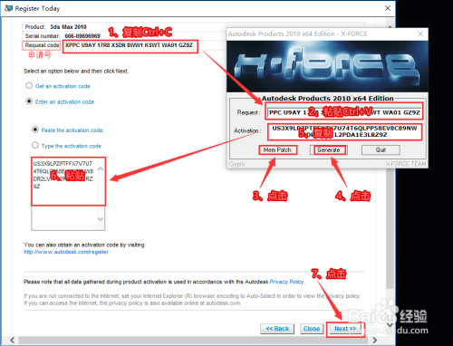 复制申请号粘贴到“Request ”框中,先点击“Mem Patch”,再点击“Generate”,然后复制“Activation”中生当作的激活码,粘贴到激活框内,最后点击“Next(下一步)”。