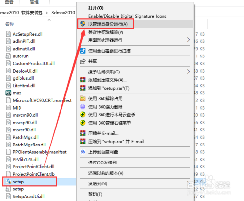 打开文件“3dmax2010安装包”,鼠标右击“setup”,选择“以办理员身份运行”。