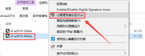 打开文件“注册机”,鼠标右击“xf-a2010-64bits”,选择“以办理员身份运行”。