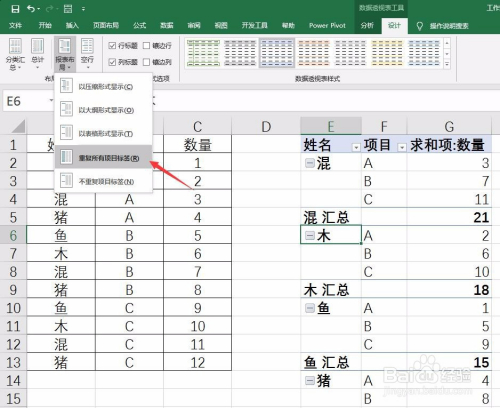 继续点击“设计”选项卡中的“报表结构”,选择“反复所有项方针签”,如下图所示: