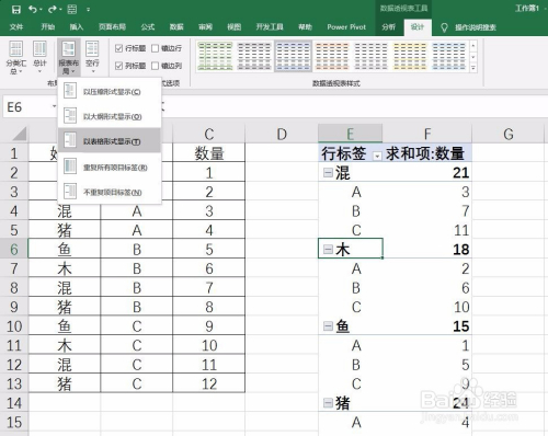 在选中数据透视表的前提下,点击“设计”选项卡中的“报表结构”,选择“以表格形式”,如下图所示: