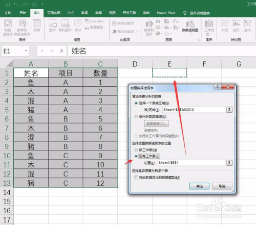选择数据透视表放置的位置,本例中是与数据源放到统一个工作表中,故设置如下图所示: