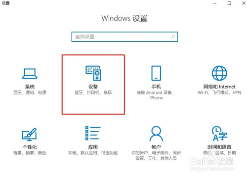 在Windows设置页面中,选择“设备”按钮,点击选择该按钮进入设备页面。