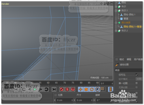 建立一个圆柱,半径为200,扭转分段为20,高度为200.将圆柱体调整到如图1所示的位置,将圆柱上半部门删除。如图2所示。这个圆柱用来作参考用。