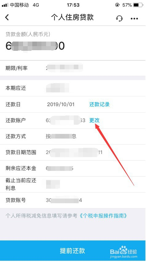 进入之后可以看到贷条目的详情,包罗贷条目金额,还条目日,还条目账户等,我们选择还条目账户后面的“更改”按钮,如图所示。