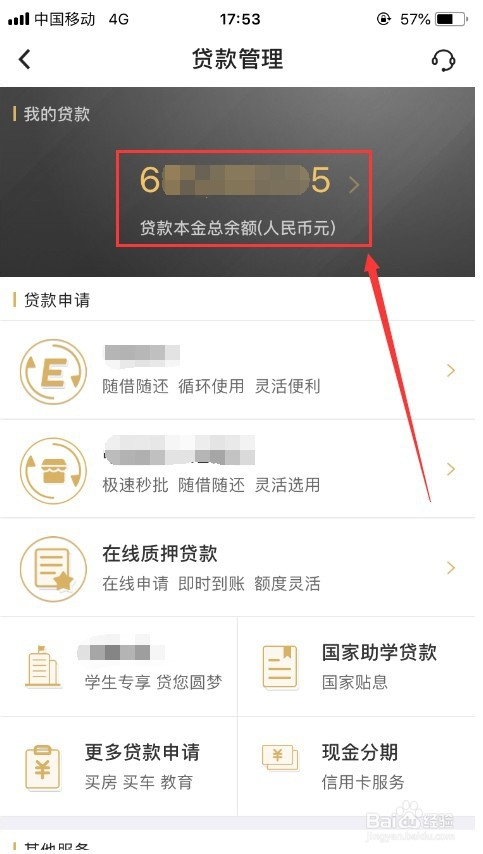 首先,打开中国银行手机银行客户端,进入首页之后,选择此中的“贷条目”,如图所示。