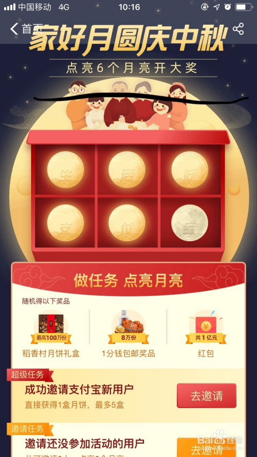 下拉菜单看下如何做使命,若是邀请一名支付宝新用户可以获得1盒月饼,点击去邀请