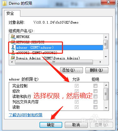 然后选择方才添加进来的用户,选择下面的拜候权限,然后点确定