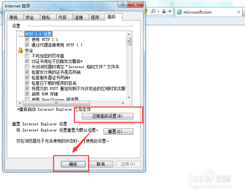 若是仍是有问题,可以在【高级】界面直接选择【还原高级设置】,然后【确定】,最后再次重启