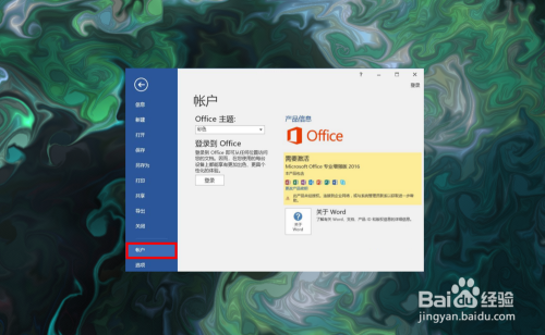 打开文件菜单之后,在左侧找到并点击帐户选项,打开帐户设置选项。