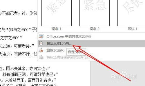 然后在弹出的水印下拉菜单中点击“自界说水印”的菜单项。