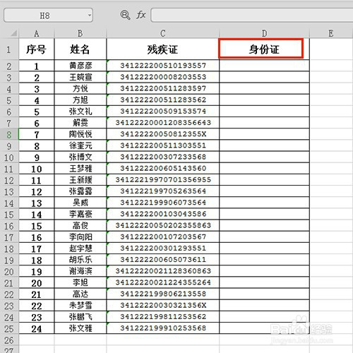 为了使表格美不雅,我们在残疾证右侧输入身份证并加上框线,如图所示。