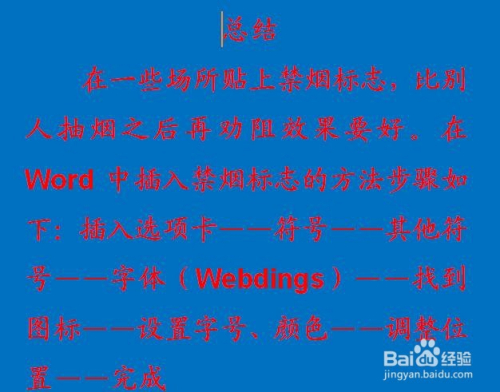 总结:在一些场合贴上禁烟标记,比别人抽烟之后再劝阻结果要好。在Word中插入禁烟标记的方式步调如下:插入选项卡——符号——其他符号——字体(Webdings)——找到图标——设置字号、颜色——调整位置——完当作