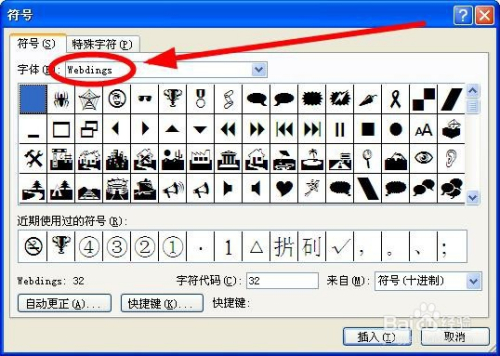 在弹出的“符号”对话框中,选择“Webdings”字体