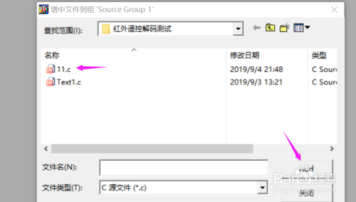 接下来右击“Soure Group1”,选择“增添文件到组Soure Group1”,然后在呈现的对话框里选择“11.c”,点击“Add”,将适才的C文件添加到工程中