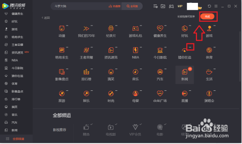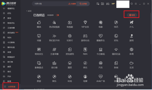 双击打开电脑桌面上的腾讯视频——点击左下角的全数频道——点击:办理,打开频道办理界面。