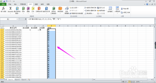 方式二:(直接输入)选中要插入公式的单位格,在英文输入法下输入”=“,接着输入”IF(MOD(MID(A2,17,1),2)=1,"男","女")“,点击确认即可,同样双击主动填充柄进行标的目的下填充,操作完当作。
