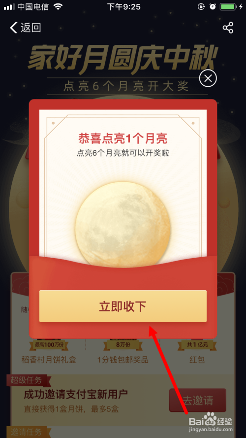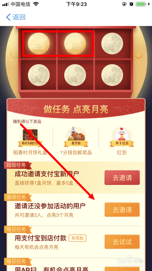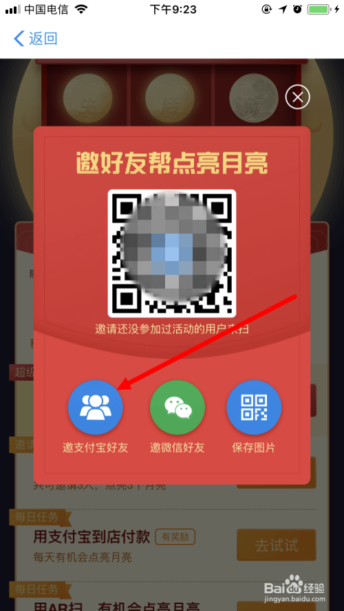 支付宝 家好月圆庆中秋 活动中有一个使命是 邀请还没有加入活动的用户 ,使命完当作后我们也可以点亮一个月亮。下面小编就跟大师分享一下邀请老友点亮月亮的方式。