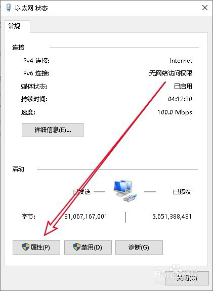 然后在打开的以太网状况的窗口中点击左下角的“属性”按钮。
