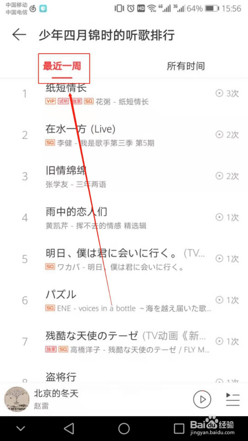 然后点击【比来一周】,便可以看到比来一周的听歌排行。