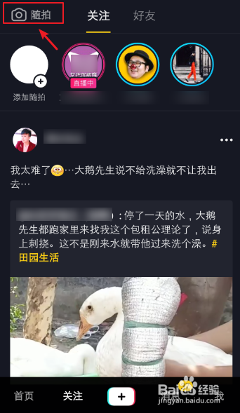 在存眷页面,点击左上角的【随拍】。
