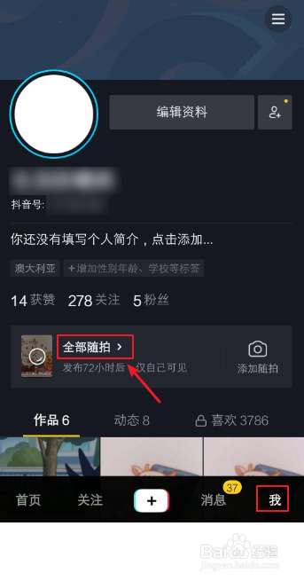 发布当作功后,点击右下角的【我】,再点击【全数随拍】。