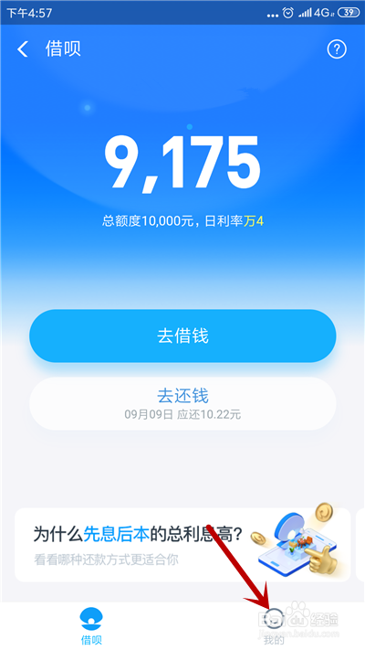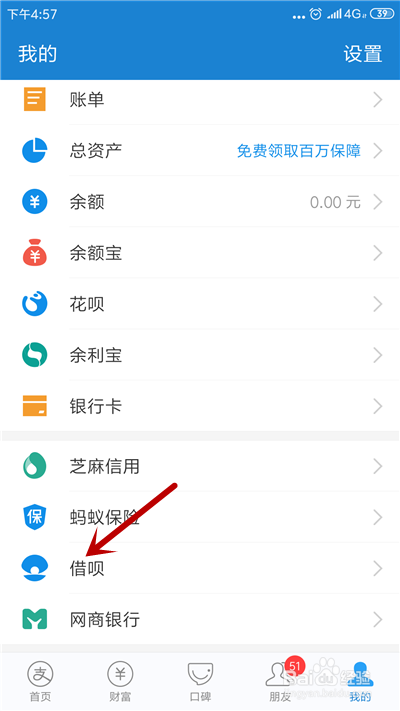 在小我中间里,点击【借呗】应用。