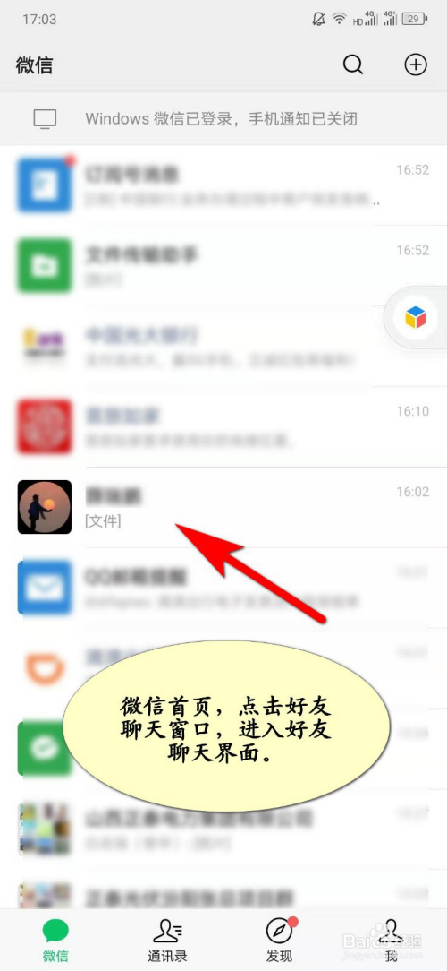 手机打开微信,微信首页,点击老友聊天窗口,进入老友聊天界面;