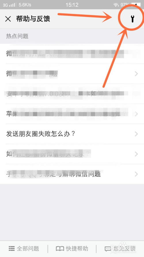进入帮忙与反馈页面后,点击下右上角的扳手东西图标