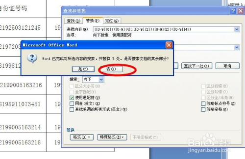 总结:本方式运用的是函数提取。选中身份证信息——找到“查找和替代”对话框中的“替代”——查找中输入“([0-9]{6})([0-9]{4})([0-9]{2})([0-9]{2}) ([0-9]{4})”——替代中输入“\2年\3月\4日”——单击“更多”——勾选“通配符”——“全数替代”——提取当作功