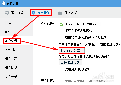 然后单击上方的【平安设置】,再单击左侧的【动静记实】,接着单击【打开动静办理器】按钮。