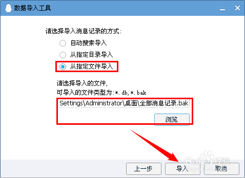 然后选择导入动静记实的体例为“从指定文件导入”,单击【预览】按钮,选择适才导出的bak文件,最后单击【导入】按钮。