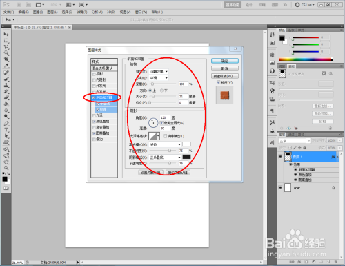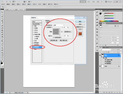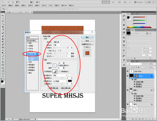 双击图示自界说图案图层空白区域,弹出【图层样式】设置栏,按图示设置好图层样式的各个参数,完当作异形墙砖结果的建造。