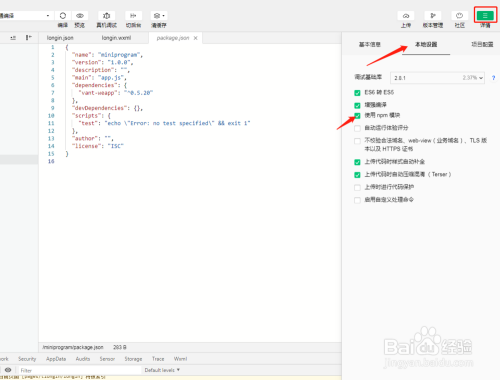 最后一步我们在微信小程序开辟东西右上角找到:详情---当地设置--利用npm模块。设置当作功我们的教程竣事。