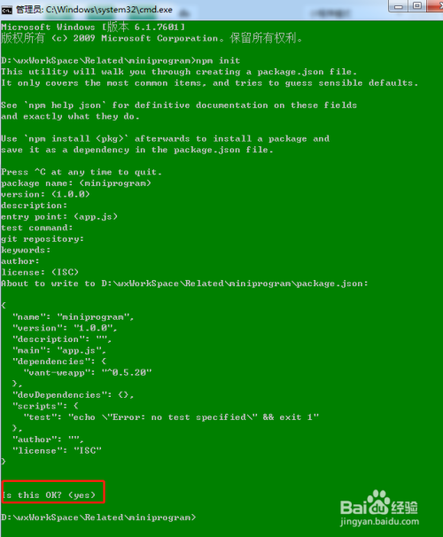 在号令窗口中键入npm install。然后所有设置装备摆设都按默认设置装备摆设进行,只需点击回车键即可。当提醒“Is this OK?<yes>”时,我们只需点击回车即可。