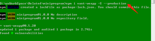我们继续利用号令提醒符窗口,键入"npm i vant-weapp -S --production",该号令是经由过程npm安装我们的vant-weapp。当作功的标记是项目中生当作文件“package-lock.json”。
