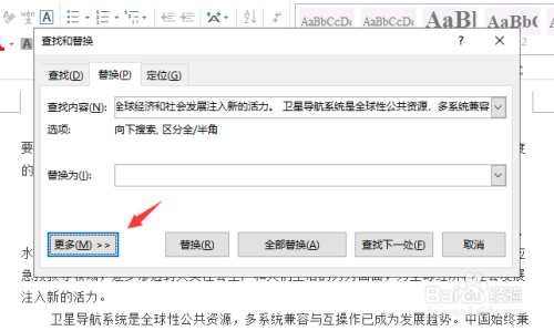 打开“查找和替代”对话框,在“替代”选项卡中单击“更多”按钮。