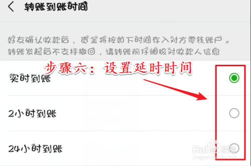 微信支付延时到账设置步调六:进入“转账到账时候”设置界面今后,在界面中设置延时到账的时候。