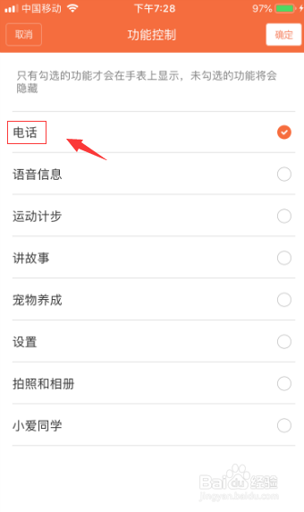 这里只有被勾选的项目才会在德律风手表中显示,未被勾选的项目将会被埋没,我们保留“德律风”功能,其余都打消勾选。