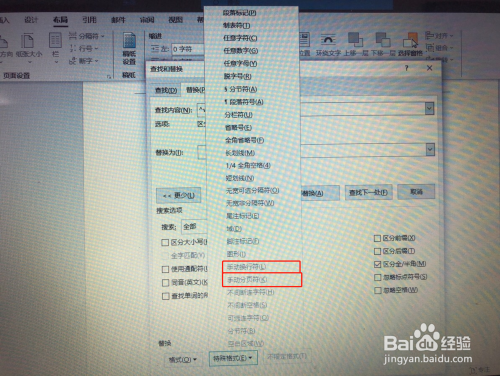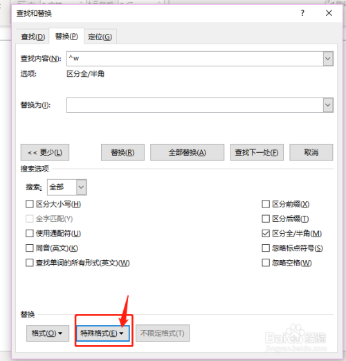 因为利用了主动换行符,导致空白页,Ctrl+H,打开查找/替代,点击“特别格局”