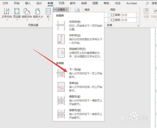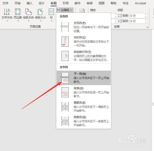 然后,点击菜单栏中的”结构“,选择”分节符“里的”下一页“